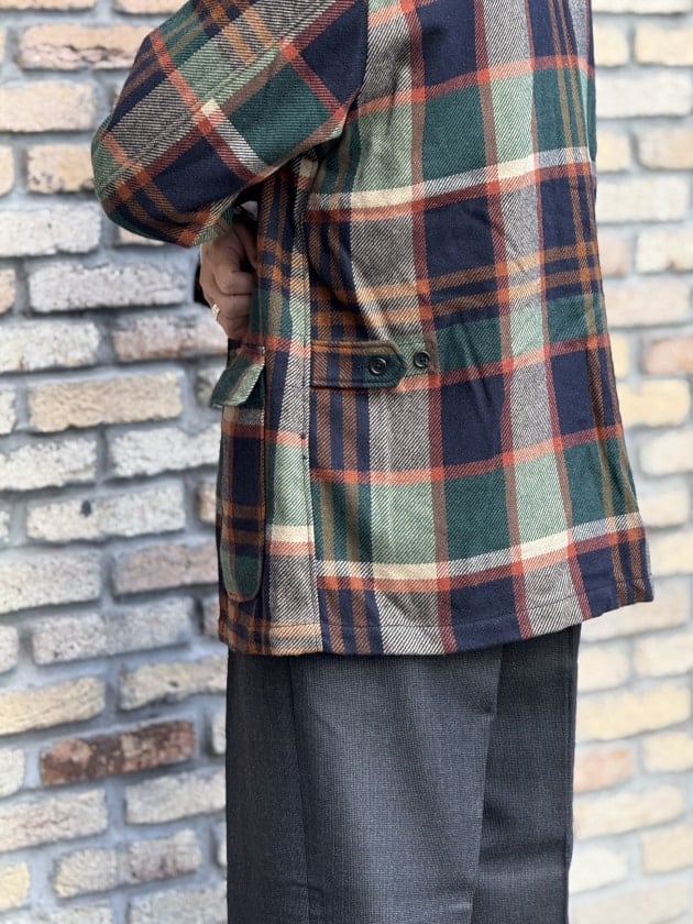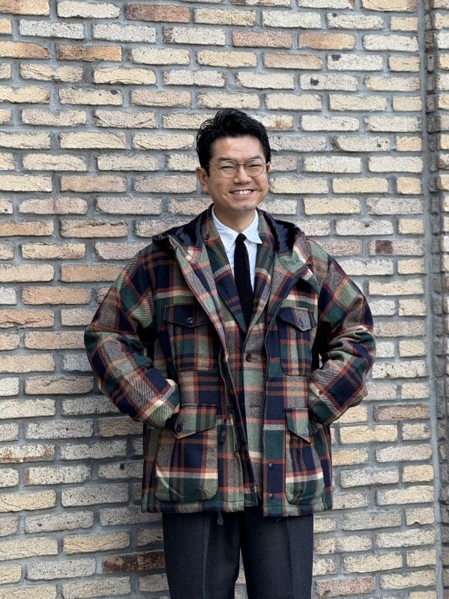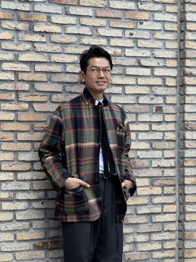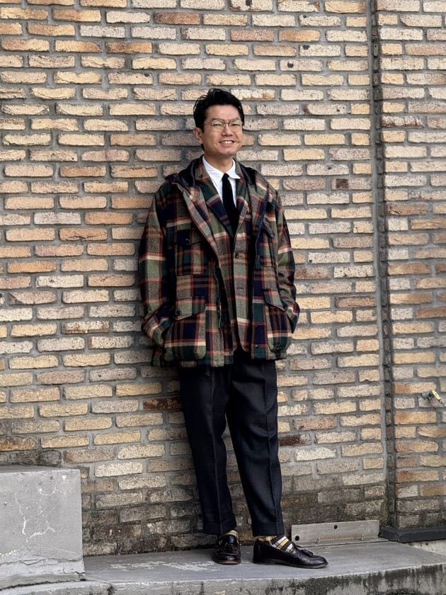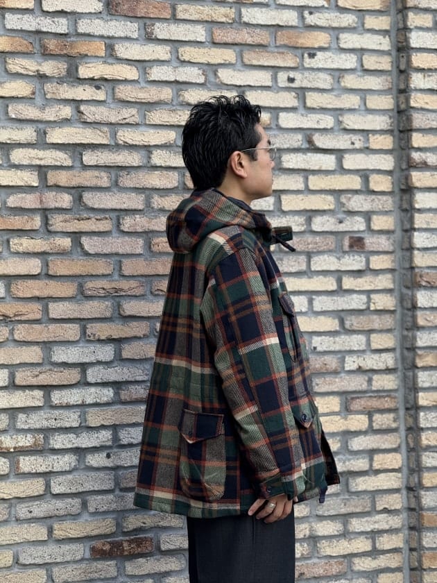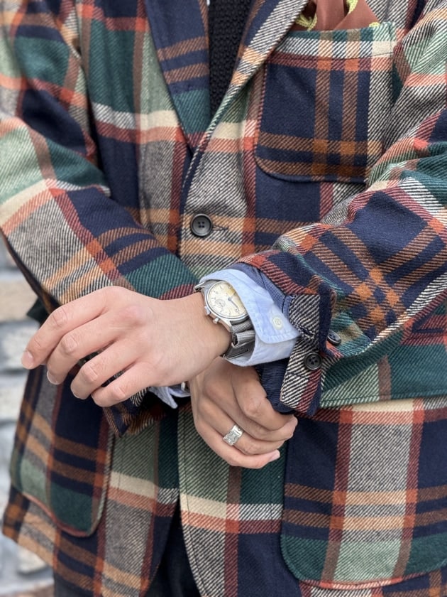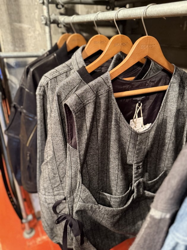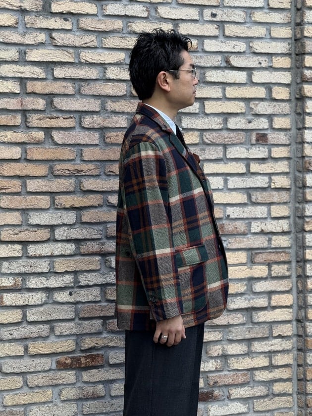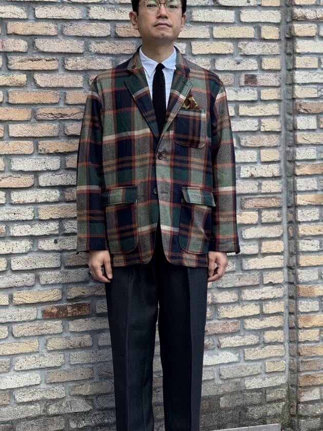 今回ご紹介いたしますのは、ENGINEERED GARMENTS(※以下 EG)でございます。2025秋冬シーズンの新作が多数 ビームス プラス 原宿 に入荷いたしました。中でも、今シーズンのEGの一つのトピックであるネイビー×オレンジの配色が目を引くチェックの生地は、密度の高いヘビーウールを使用しております。着心地は柔らかく、風合いの良さも抜群です。
