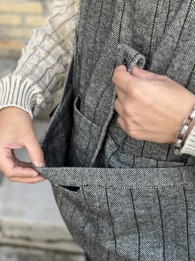 こちらのデザインは、その名前の通り、新聞配達員のユニフォームが由来となっております。このユニークな型とウール ヘリンボーンストライプの生地の風合いの良さが相まって、EGらしい雰囲気の良い仕上がりです。