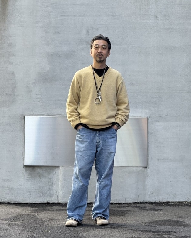 山田(兄)はブルージーンズにイエローの素朴な色合わせを…