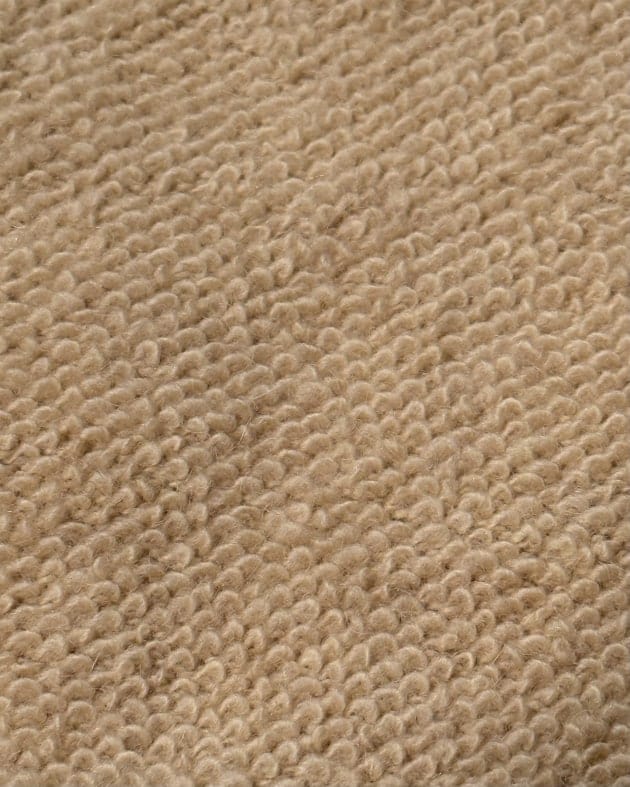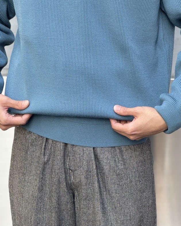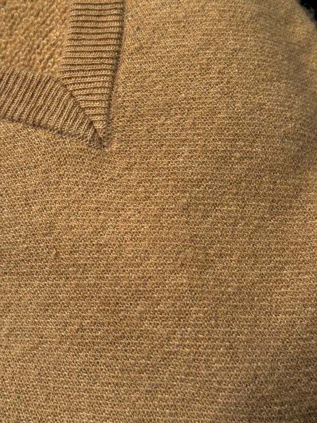 先程のハーフジップニットと同様強撚したキャメルヘアーを使用していますが、繊維が細く軽いため膨らみのある生地感が特徴です。