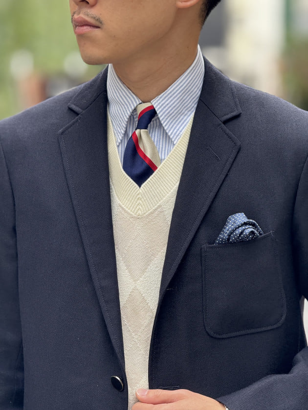 さらに腰回りをスッキリと見せる為、通常のニットベストよりも着丈は短く設定しております。