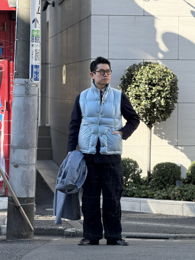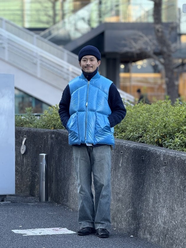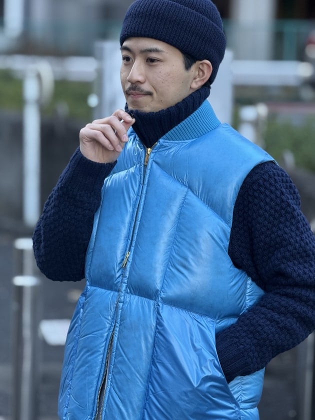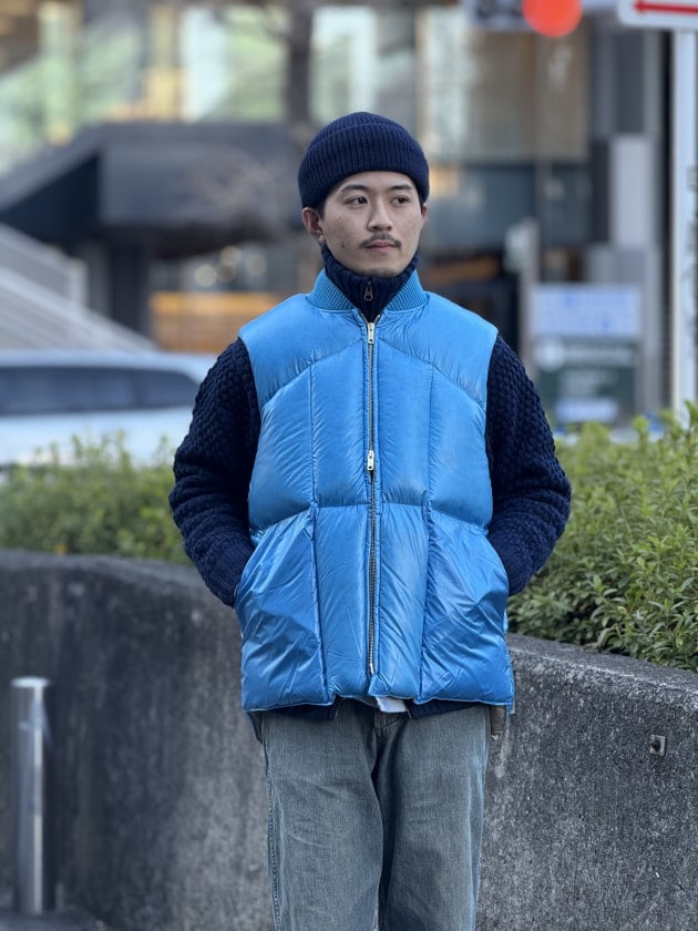 今の時期、ショップコートとブレザーじゃ寒くない?ということで、ダウンベストを。この日の私は昨年から愛用しているSIERRA DESIGNS を持って出勤しておりました。こちらもお買い求めやすくなっております。私は水色推しで。※JPN Mサイズを着用