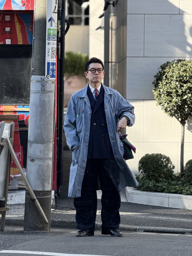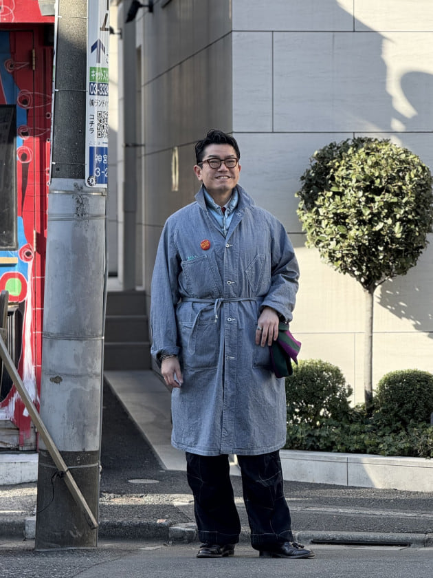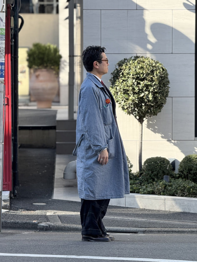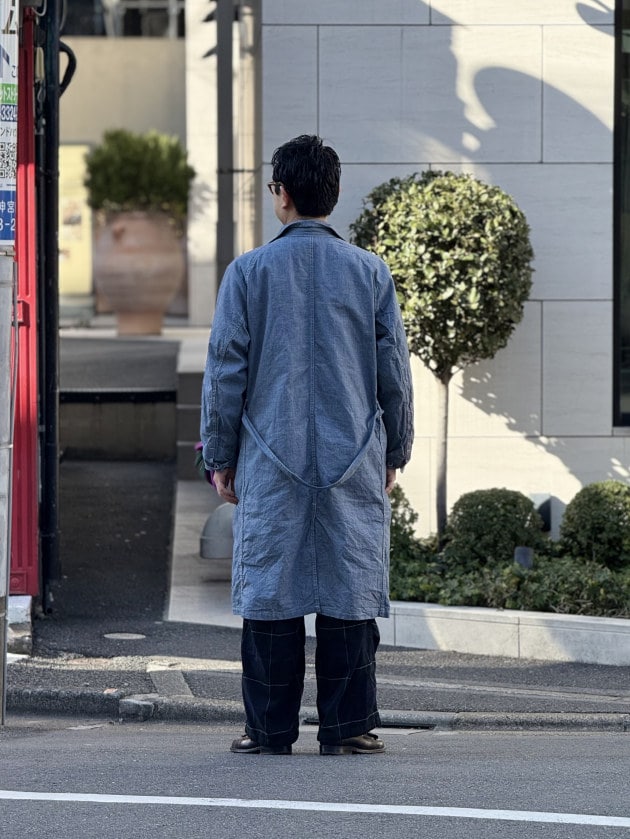 それでは、こちらから。POST OVERALLSにBEAMS PLUS が別注したショップコートです。ハイ、お買い求めやすくなっております。私は、オンオフ共にヘビロテ中です。着丈が長いので、冷たい風から身を守れます。冷たい風が体温を奪っていきますが、それを広い面積で軽減してくれますので、真冬でも私はこのコートを羽織っています(中に着込めやすいのもポイントです)。春・秋も同様です。身長175㎝細身体系の私でLサイズで着用しております。