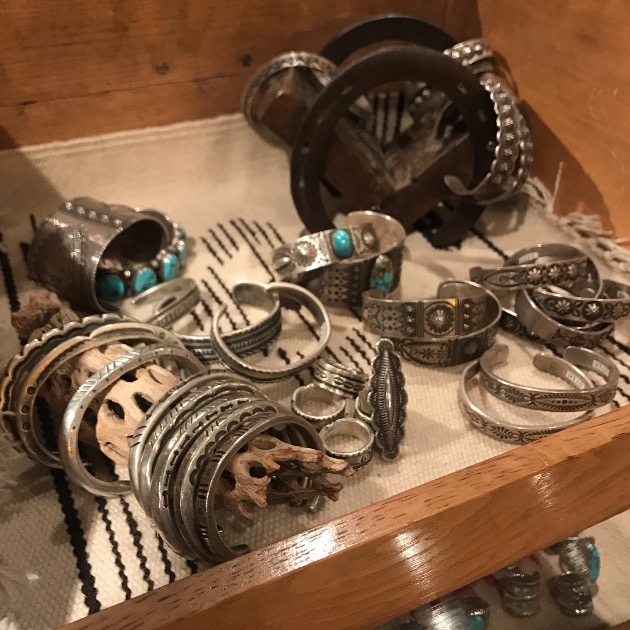 ターコイズがついたブレスレットは、別アーティストの物ですが、作風の似たものを合わせる事で統一感も出ていますね。