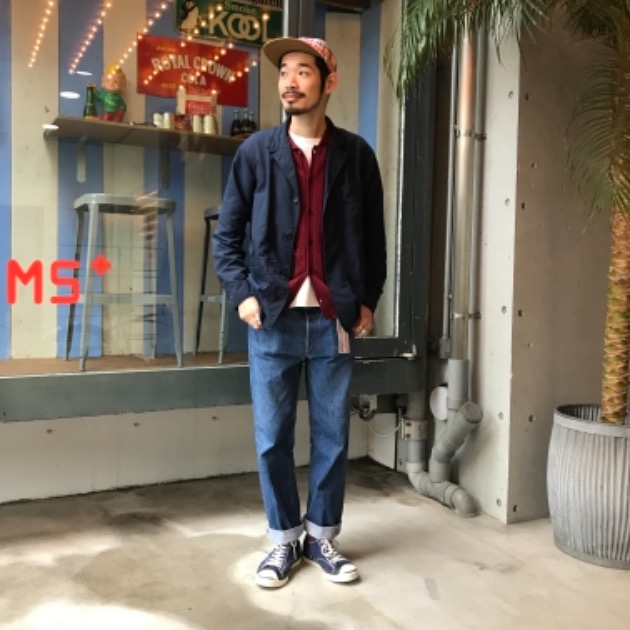 ジャケットのキャラクターを活かして、カジュアルなスタイリング。