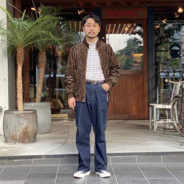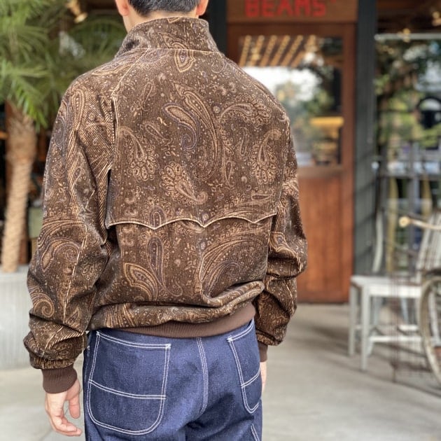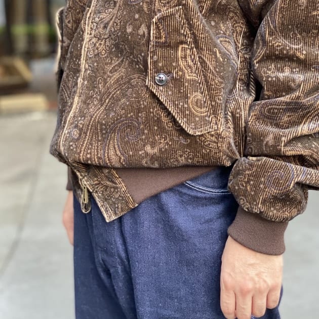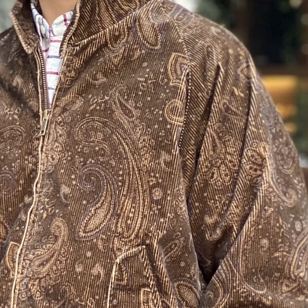 コーデュロイの上からトラディショナルなペイズリー柄を上から乗せることで完成されたもの。柄のブルゾンと聞くと少しインパクトが強すぎる傾向にありますが、今回は柄を同色にし、”抑えた柄”というもので本当に丁度良いんですよね。また、高級感もある印象なのは、独特のヌメ感だったり、光沢感だったり、はたまたペイズリー柄であったりが、重なって生み出されてます。なので、シンプルにカットソー1枚の上から羽織っても様になります。