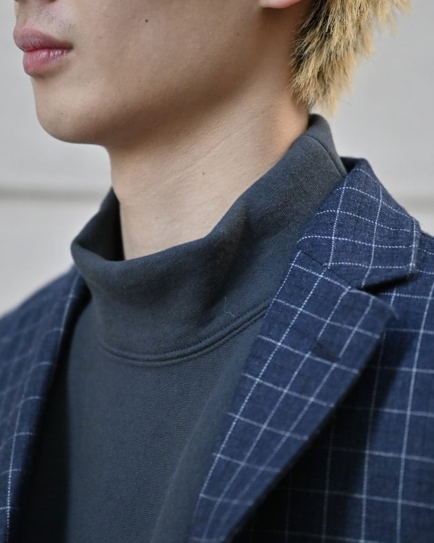 首元は程よく高さを抑えたモックネック仕様で、一枚で着用した際にも主張しすぎず、ジャケットやアウターのインナーとしても自然に収まるバランス。