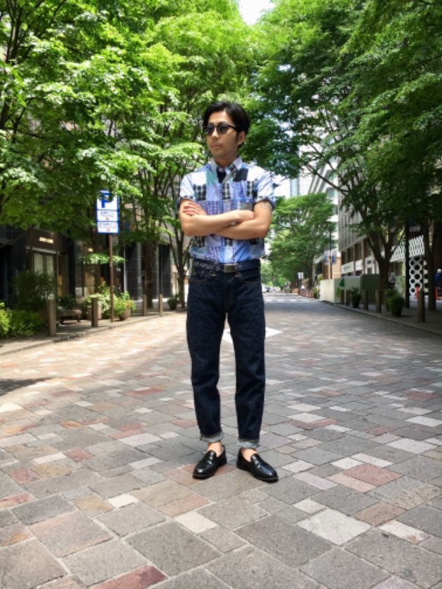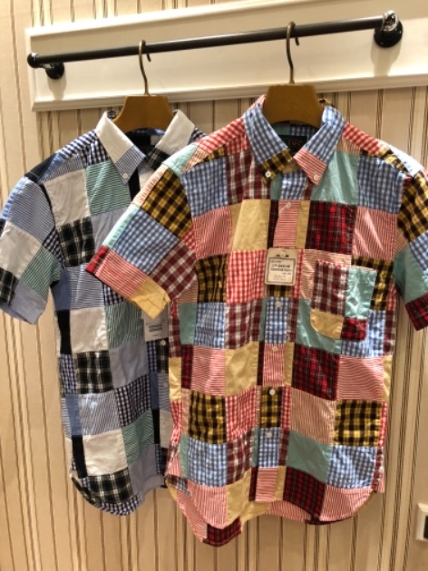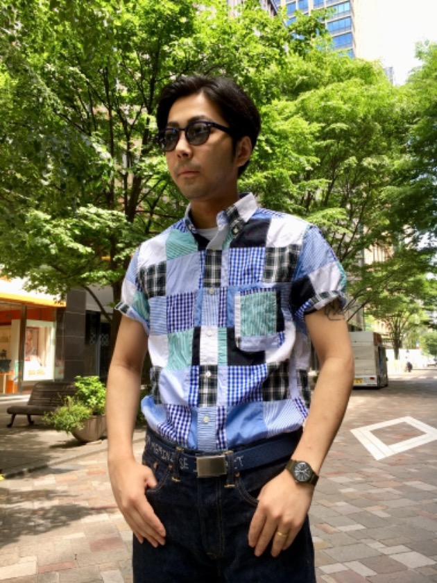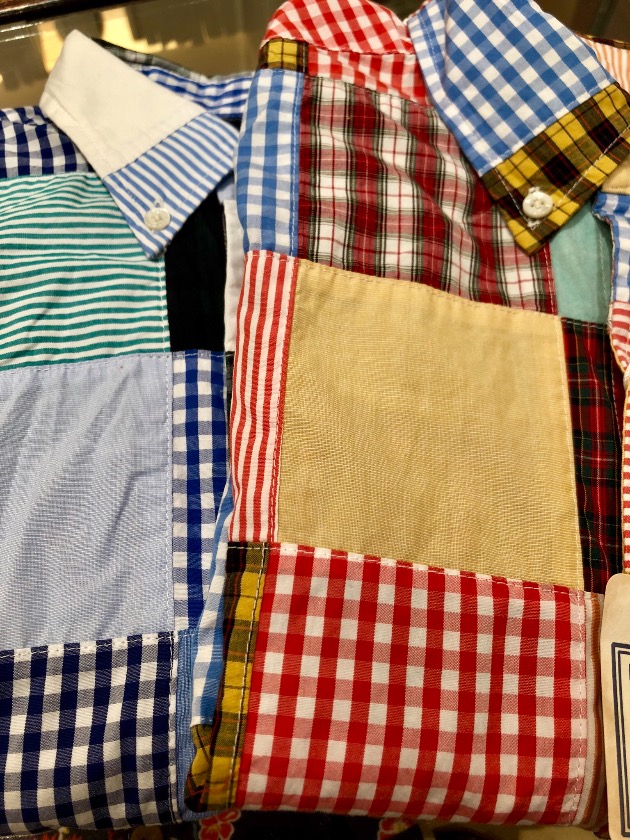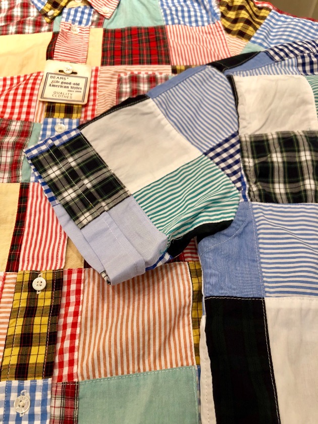 柄や無地等で構成しているパッチワークパターンのシャツ。