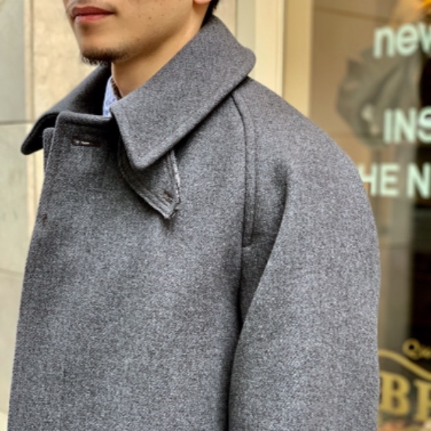 KAPTAIN SUNSHINEよりコートのご紹介。昨シーズンは殆ど店頭に並ばず、非常に人気があるこちらの2型が少量店頭に並んでいます。厚手のSuper100's原料の糸を二重織りかつ高密度に織り上げたヘビーメルトン。ずっしりとしたメルトン生地は見た目の迫力、生地の質感共に重厚な仕上がりとなっております。ヘビーメルトンと聞くと重そう・・・着疲れしそう・・・と思われる方もいらっしゃるかと思います。見た目や生地の重さかとは裏腹に、生地が柔らかく、クラシックなフィッティングのパターンは着心地が最高です。