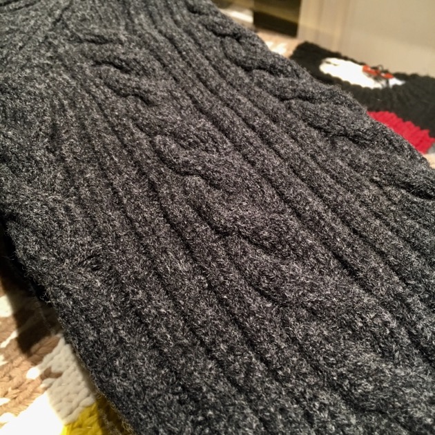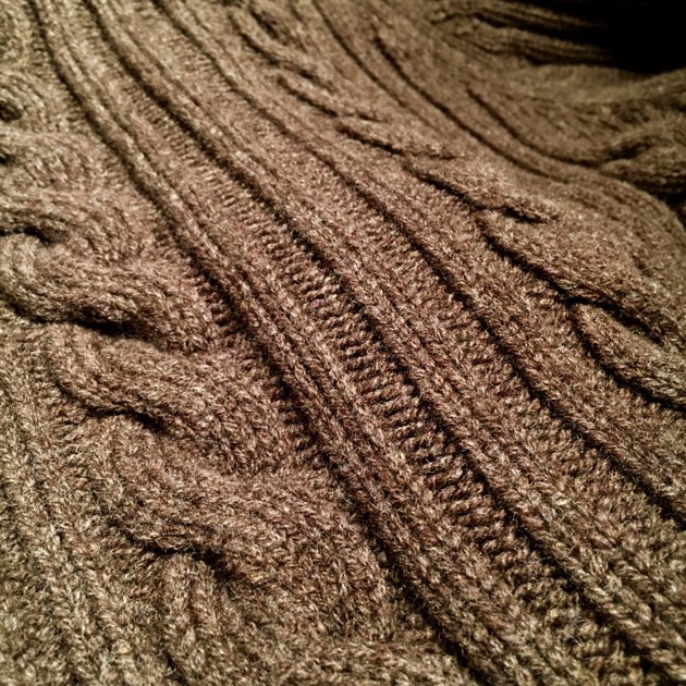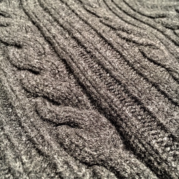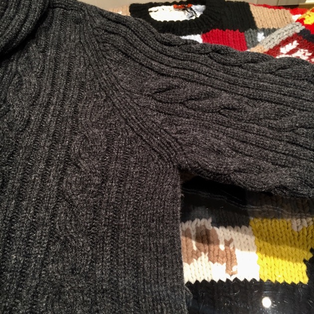 ボリューム感溢れるケーブル編みに加え、たっぷりとしたサイズ感はアウター感覚で着用できる一着です。ふっくらとしたボリュームある編み込みは空気を多く含み、寒さが増している今でも暖かく着用ができます。何よりもスコットランド製であり、着用を繰り返す事で糸の風合いが増したり、徐々に体に馴染んでいく過程は愛着が増しますね。生産国どうこうではありませんが・・・やはり信頼おけるニットメーカーが作るニットは永く愛用できるはず。