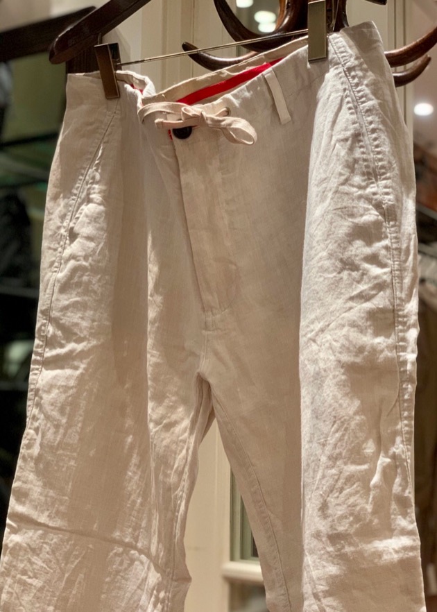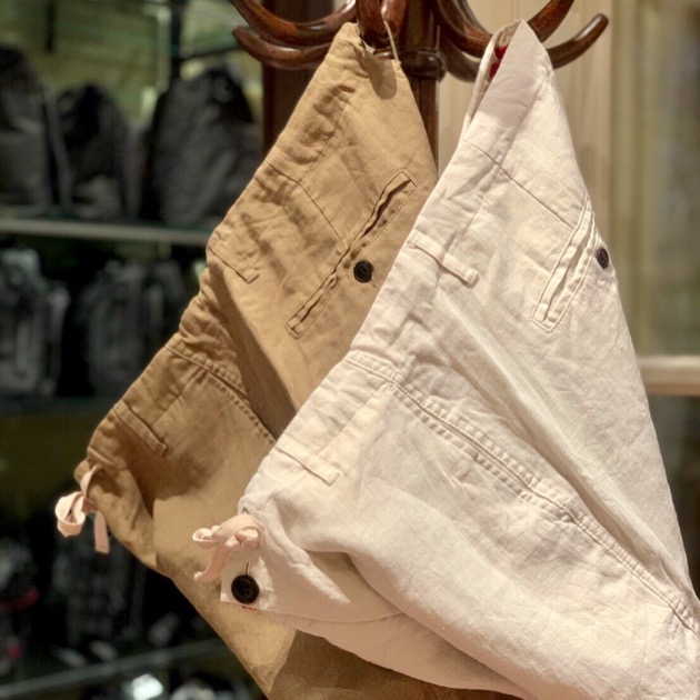 ブランドイメージでもあるリラックスウェアとして、ドローコード仕様のイージーパンツが入荷してきました。今シーズンは至ってベーシックなトラウザーズ型をベースに、表地をラミー、裏地をリネンにしたダブルフェイス仕様です。