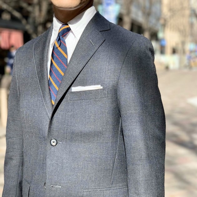 もちろんトラウザーズもオーダー可能で、このスタッフは共生地でオーダー。