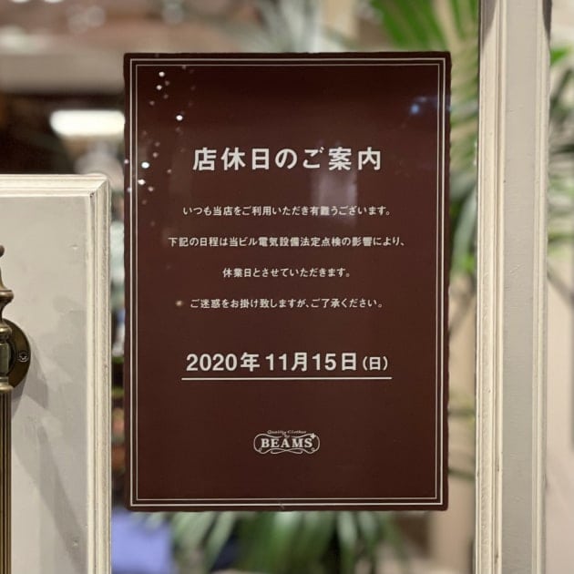 11月15日(日)、店休日のお知らせ。 桑田 祐輔 2020.11.14 いつもビームス プラス 有楽町 をご利用くださり、誠にありがとうございます。当店、11月15日(日)は ビルの電気設備法定点検の影響により、休業日とさせていただきます。ご迷惑をお掛けいたしますが、ご了承ください。11月16日(月)は、PM12:00から営業いたします。皆さまの またのご来店を心よりお待ちいたしております。KUWATA