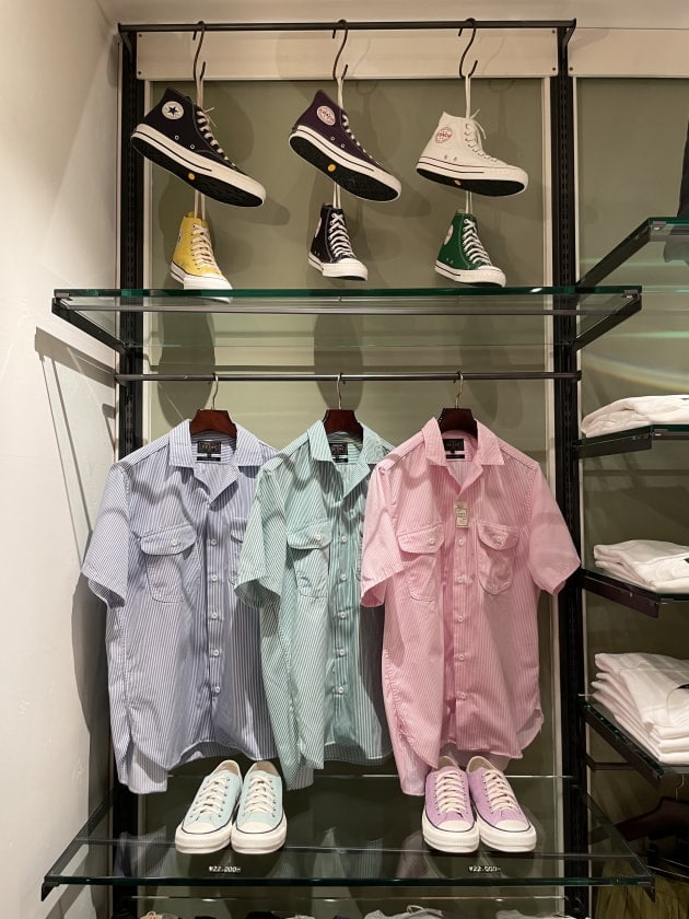鮮やかなカラーリングのワークシャツには、足元のスニーカーにも是非色味を加えて楽しんで頂きたい!と思い、ピンクやミントカラーのCONVERSE ADDICTを。