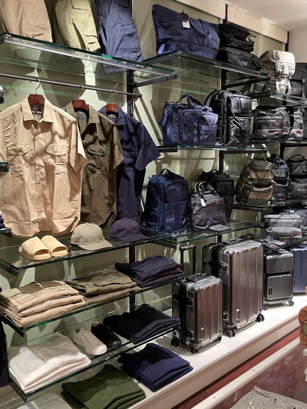 店内中央に進むとビームス プラス 有楽町ならではの【BRIEFING】のバッグを交えた壁面のコーナー。