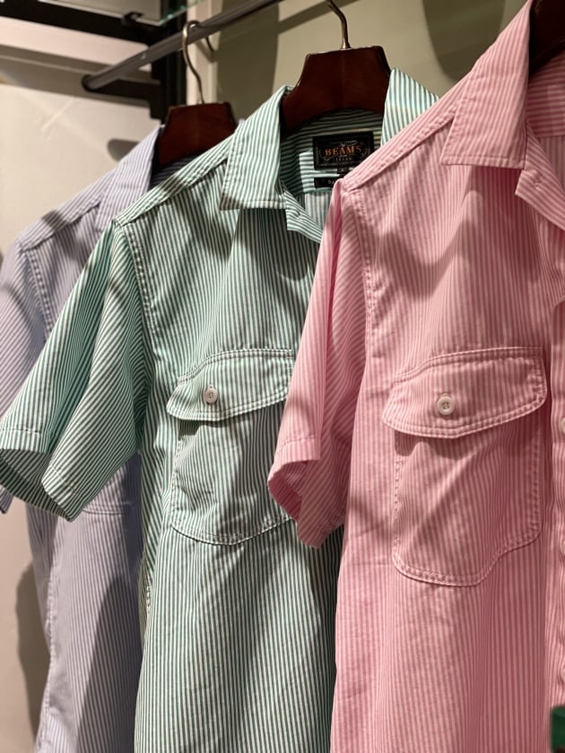 ワークウェア特有のヒッコリーストライプが、カラーリングが変わるだけでこんなにもポップな印象になるのか!と感じたコチラのストライプと、よりワークシャツらしくアメリカの雰囲気を感じるソリッドのツイル生地の2種類。