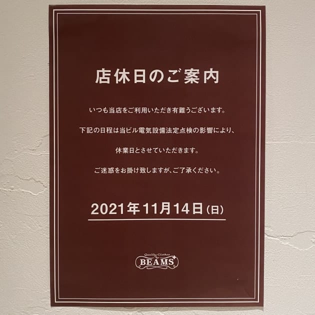 店休日のご案内 柳井 純一 2021.11.13 いつも当店をご利用いただき有難うございます。11月14日(日)は当ビル電気設備法定点検の影響により、休業日とさせていただきます。11月15日(月)からは通常営業となりますので、ご来店及びお問い合わせは15日以降にお願い申し上げますご迷惑をお掛け致しますが、ご了承下さい。ビームス プラス 有楽町
