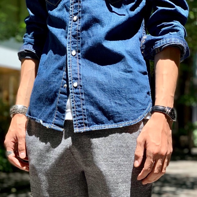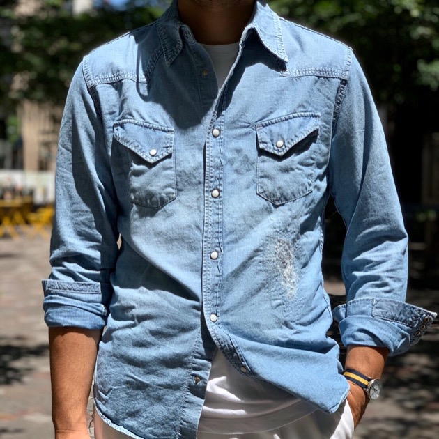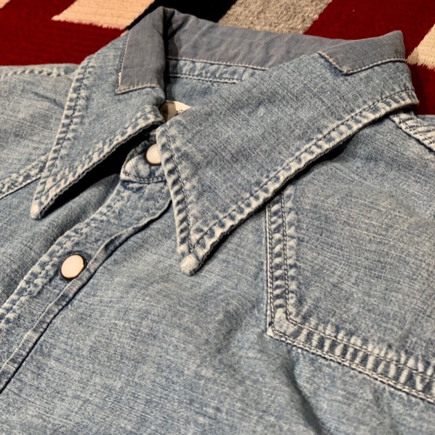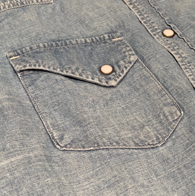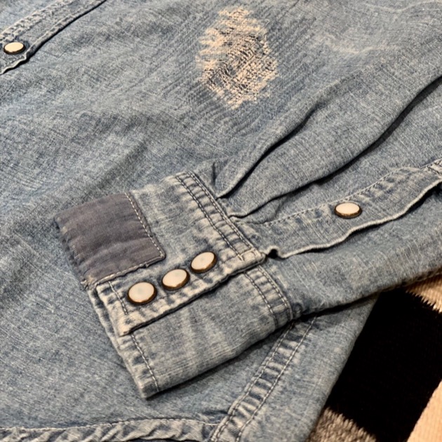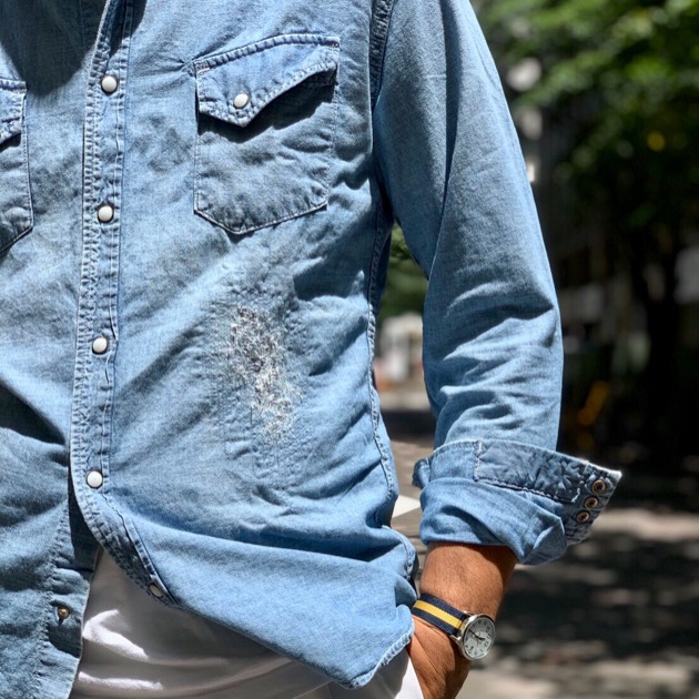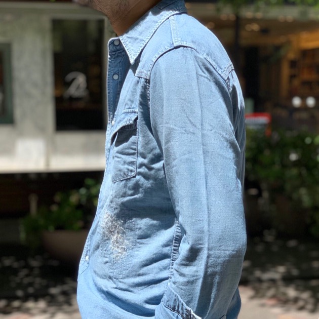 次いでシャンブレーシャツは、デニムシャツと対照的なハードな色落ち・ダメージ&リペアが特徴的です。