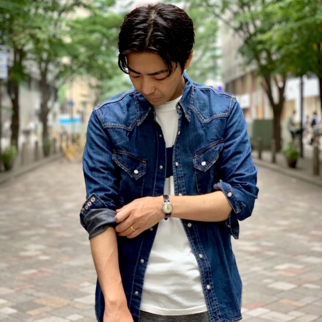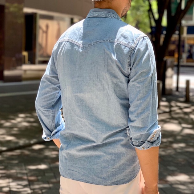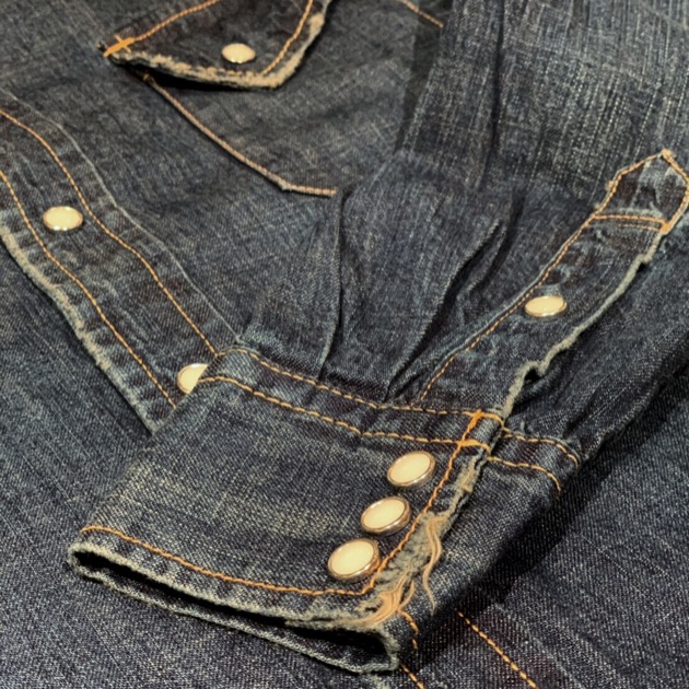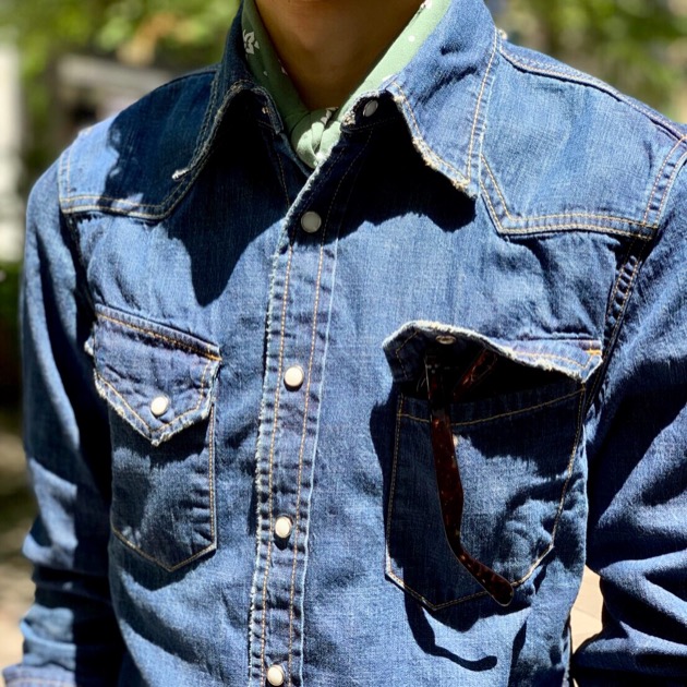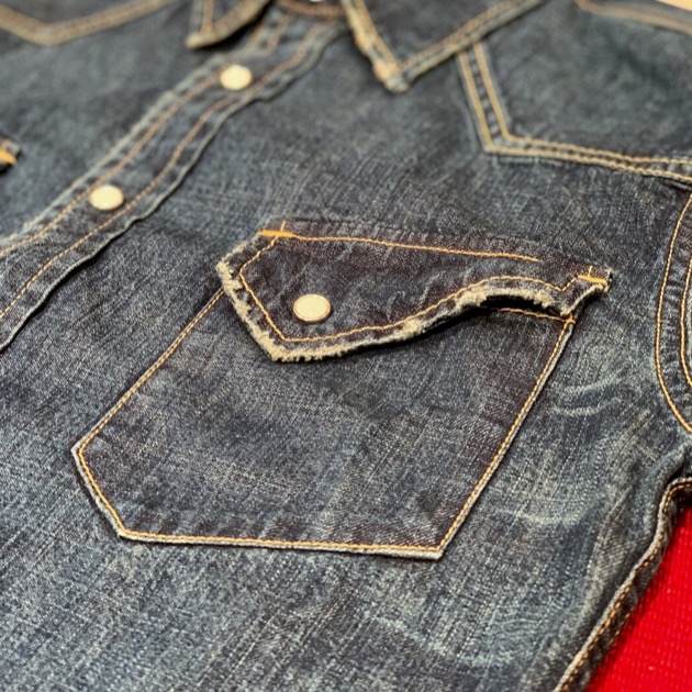 デニムウェスタンシャツは3年着古したイメージを想定し、あくまでも自然に色落ちした風合いを表現しています。