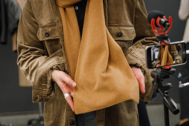 「上質なカシミヤをホールガーメントでよりカジュアルなルックスに仕上げており、通常のマフラーやストールよりも柔らかな印象を狙えます。美しい発色もポイントで、絶妙なニュアンスを挿してくれるアイテムです。」
