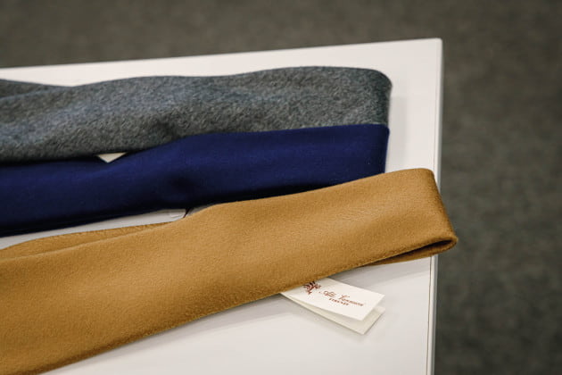 「〈ASAUCE MELER(アソース メレ)〉。カシミヤ100%のニットマフラー。ウィメンズのブランドですが、今回メンズ規格で別注して展開。もちろんユニセックスでもお使いいただけます。」