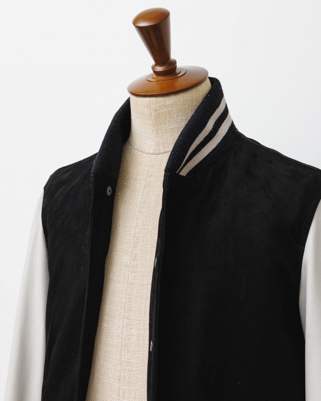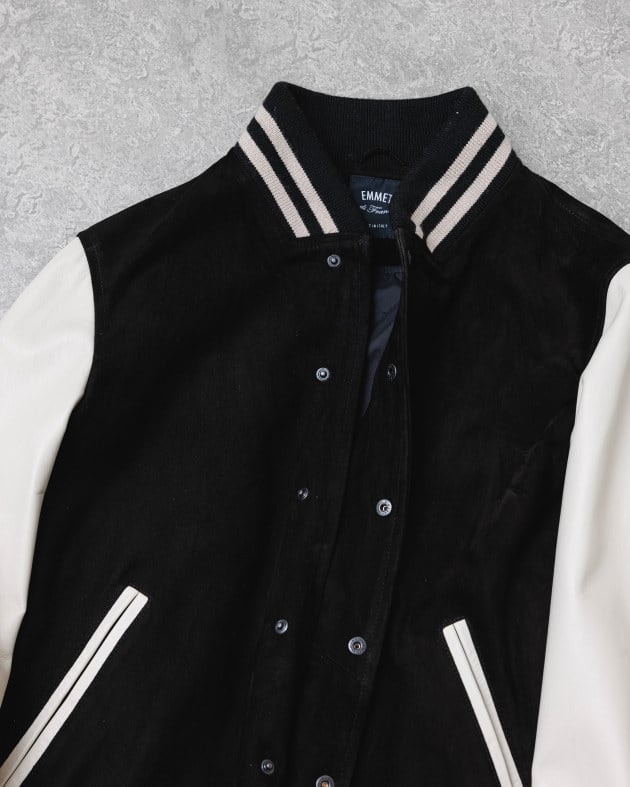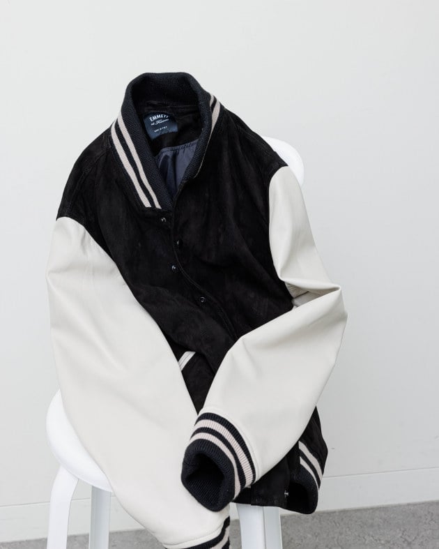 〈EMMETI〉の別注バーシティジャケット。潔いツートンカラーに上質な素材遣いが洗練された佇まい。オリジナルのスポーティな雰囲気は残しつつ、上品かつ都会的な、大人の一着に仕上がっています。ぜひチェックしてみてくださいね。