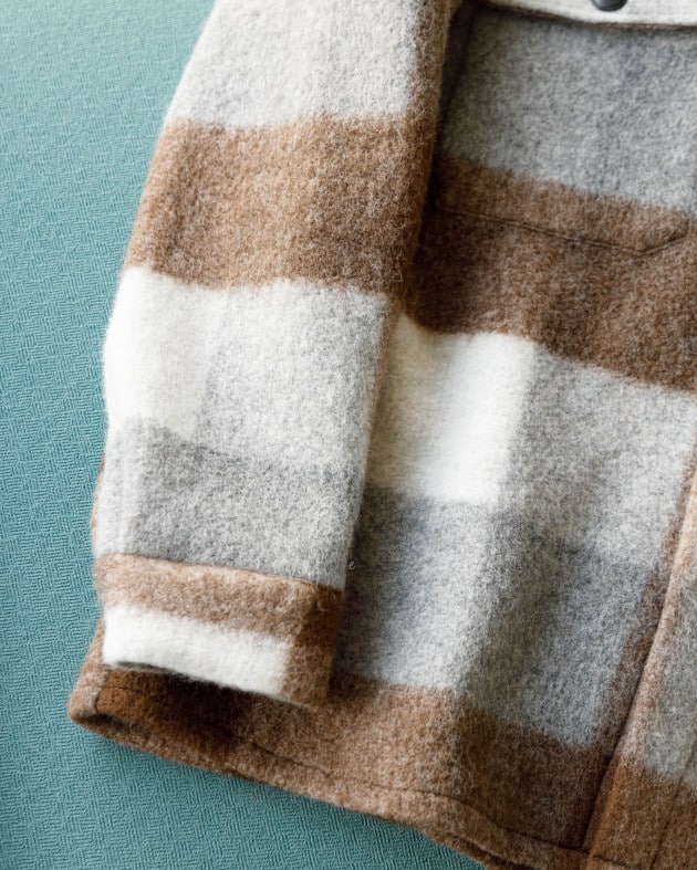 今回最も注目すべきはやはりこの生地。肉厚なウールベースの起毛素材は軽いアウターながらしっかりとした温かみを感じる仕上がり。
