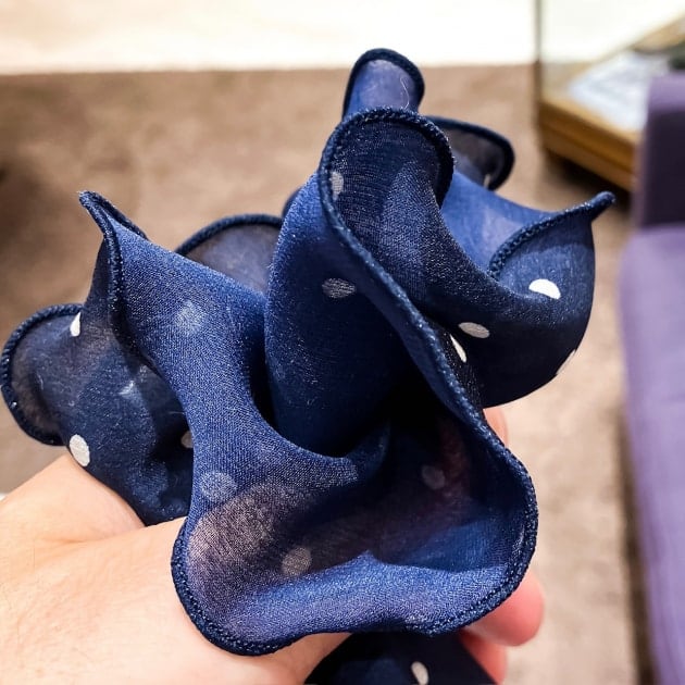 こんな感じで雰囲気が全然変わって見えます。いかがでしょうか。無地もドットもすごく使いやすいと思います。私は全色持っておりますが、このチーフが気に入ってしまい、ほかの柄物のチーフを全く使わなくなってしまいました。それくらい良く出来たポケットチーフです。是非、お使いになってみて頂きたいと思います。