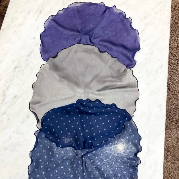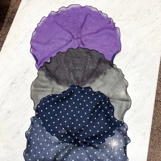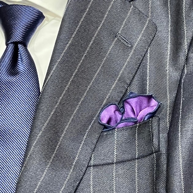 それじゃ、「何枚ポケットチーフがあればいいんだ」という事になると思いますが、実は、このポケットチーフは通常のスクエアタイプとは違い、円形をしています。そして表と裏のカラーが違うために、1枚で4通りの挿し方が出来るポケットチーフなんです。画像で3通りのポケットチーフの挿し方をお見せしましたが、これはすべて1枚のポケットチーフの挿し方と表裏を変えただけなんです。それで、色のトーンを落ち着かせたり、夜のシーンに似合うような派手目なカラーにしたり、円形の端の部分を出して、バラの花のような形に見せたりが出来るわけなんです。