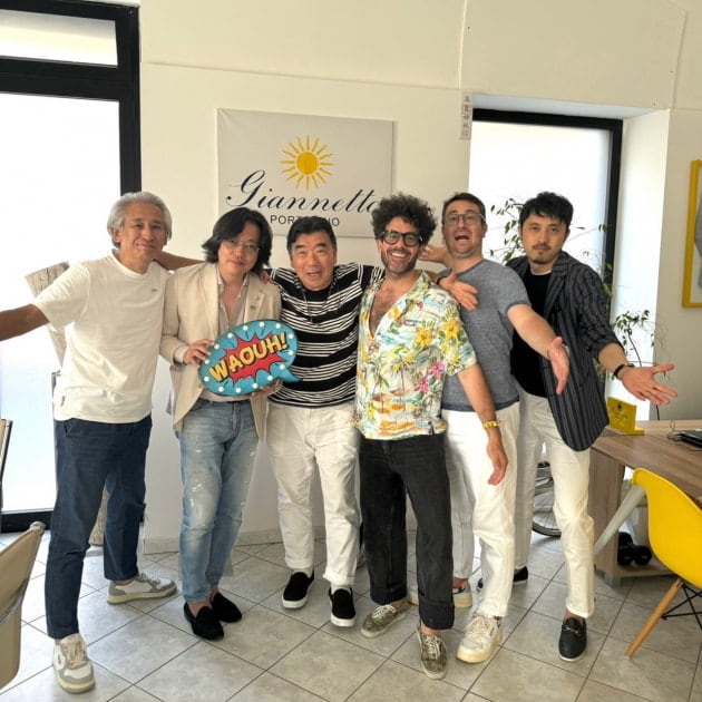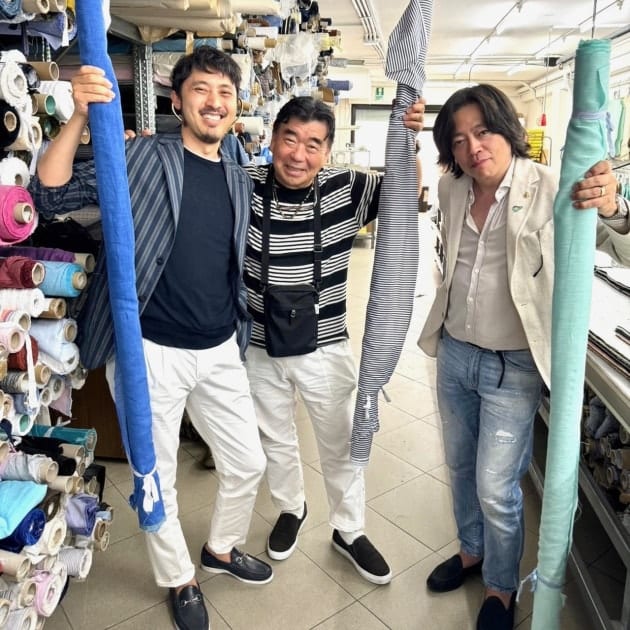 オーナーのベッペ・ヌーニェス氏と記念のショット。ヌーニェス氏が着ているのは スティレ・ラティーノのリネン100%のスーツです。