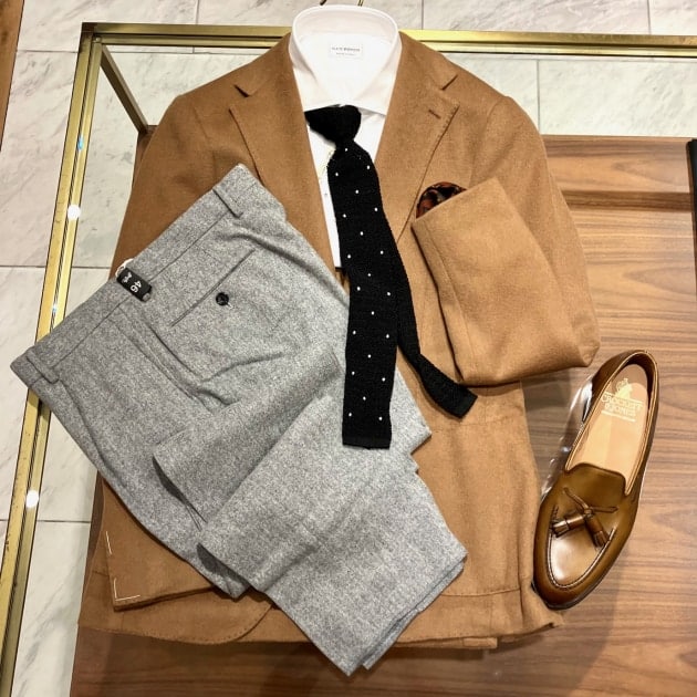 このキャメルカラーのジャケットにブラックのニットタイは、映画/勝手にしやがれのジャンポール・ベルモンドが思い浮かびました。そしてライトグレーのサキソニーのパンツとの組み合わせは、華麗なるギャツビーのロバート・レッドフォードのようなハイソサエティな雰囲気を感じます。