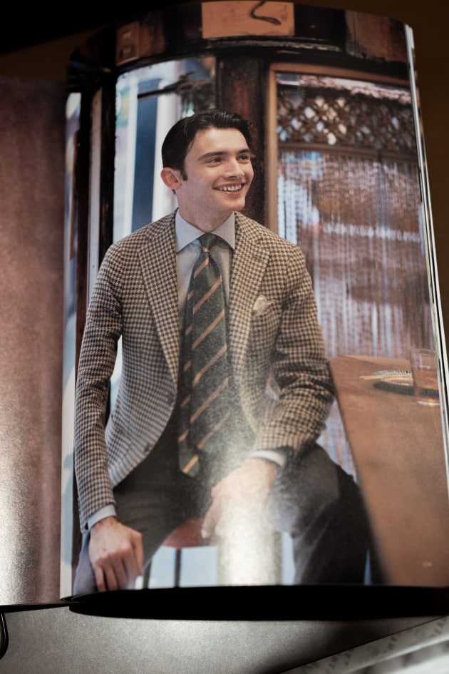 シャツとタイの濃淡のバランス、ネクタイのストライプとジャケットの柄感がしっかり分離していること、カントリーな柄感ながらそう見せない色使いと素材使い。