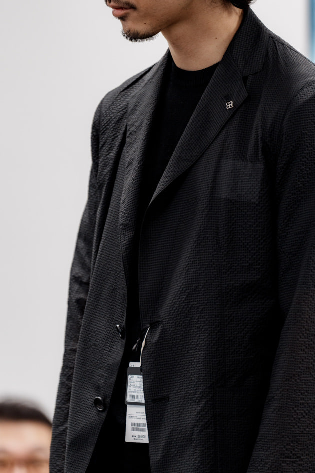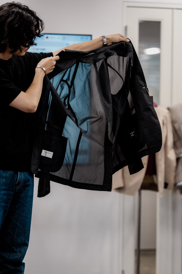 薄手ながらしなやかなコシを持ち、着用した際には自然な落ち感と美しいドレープを表現。軽快さと存在感を兼ね備えた一着です。