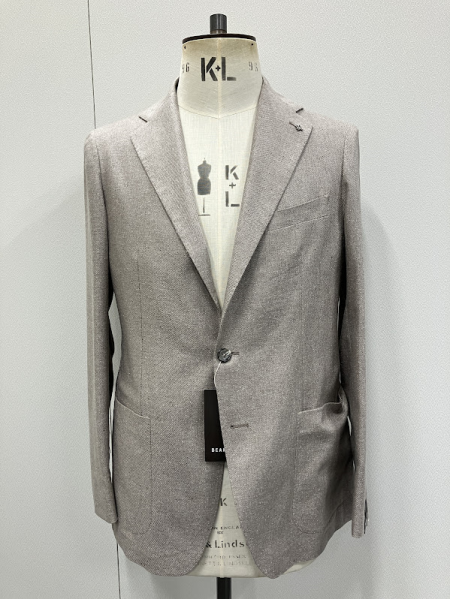 ピンクとサックスブルーのヘリンボーンという季節感感じるジャケット。リネンの清涼感とヘリンボーンが生む掠れた表情が非常に雰囲気いいです。