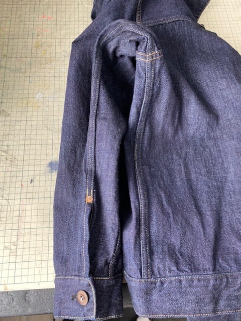 現代的なバランスのファーストモデルとは、どのようなことかといいますと、ヴィンテージのファーストモデルはどんなに程度が良くても縦方向の生地づまりがものすごく、ゆったりとした身幅に対し、着丈はおなかの真ん中といったくらいといった、実際にGジャンとして着れるバランスではないという事がいえるのですが、それを解消し「着れるファーストモデル」をとことんこだわって作ろう!というのが、このPREMIREデニムジャケットです。着丈の寸法は、当時(1950年代)に店頭で販売されていた時のサイズスペックをデニムの文献から調べ、その着丈で着れるように、今回使用するデニム生地の縮率を計算し、その分をプラスすることで、本来のサイズバランスで着れるファーストモデルを再現しています。