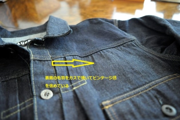 さらには、ワンウォッシュすることで、生地の表面に出てきた白っぽい毛羽をガス焼きすることで、よりビンテージ感を強く表現しています。