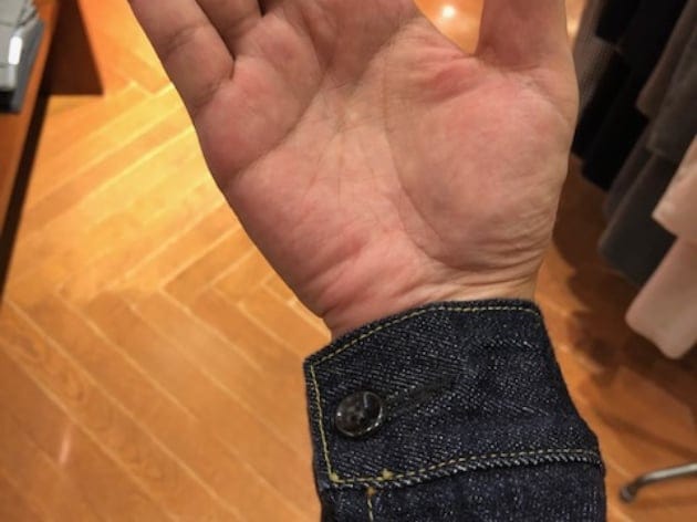 カフスの位置もあえて当時のモデルを踏襲しています。脇線から袖までを一直線に縫い進んだ先にカフスがありますが、これは、単に生産性を求めてのものだと考えらるそうです。この位置にカフスがある場合実際にカフスを止めると手首の下にボタンが来てしまいます。でもそれが、このGジャンの味つけになっています。私が書いた文章だけだと「デッドストックのリメイク」のように感じられるかもしれませんが、実際にそでを通すと全くそんなことはなく、現代的なGジャンそのものです。決して古臭くありません。ベーシックなスタイルがお好きな方にも、このGジャンを一枚羽織っていただくだけでなんとなくご自分が新鮮な感じになると思います。