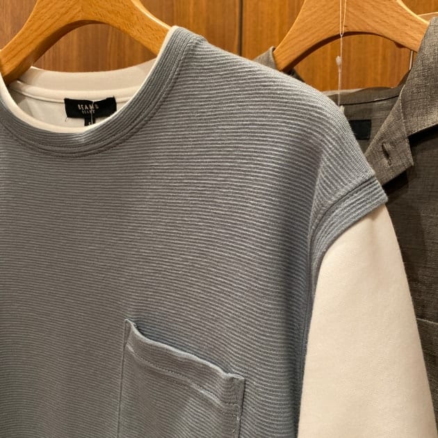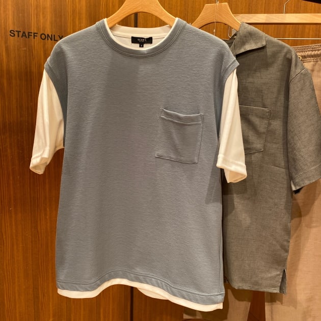 Tシャツにベストを重ね着しているようなフェイクレイヤードのディテールになっておりまして、1枚でレイヤードスタイリングが完成します。