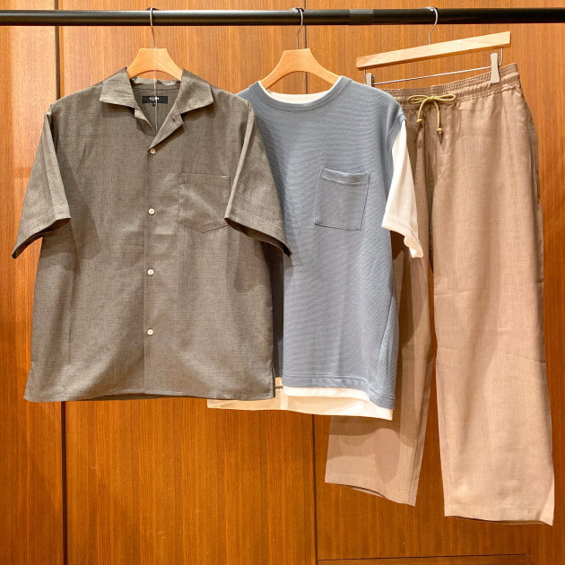 本日は、メランジ生地のオープンカラー半袖シャツのコーディネートのご紹介をさせていただきます。