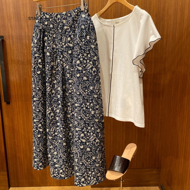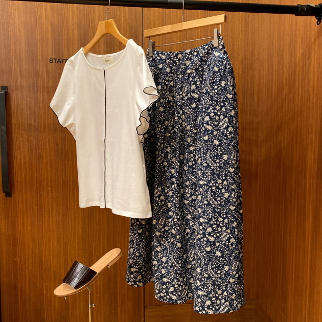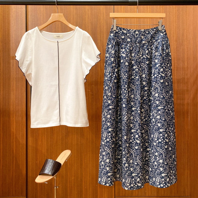 可憐な印象のオフホワイトのメローフリルスリーブプルオーバーに、上品な花柄フレアスカートをネイビーで合わせ、ブラウンのフラットサンダルで、夏から秋にかけてのコーデを意識してスタイリングを組んでおります。