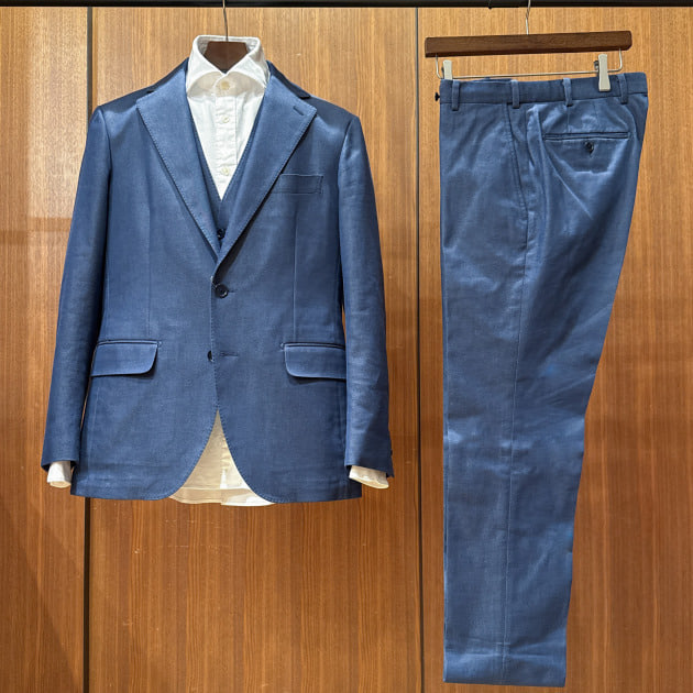 本日は、ブルーのストレッチデニムセットアップのコーディネートのご紹介をさせて頂きます。