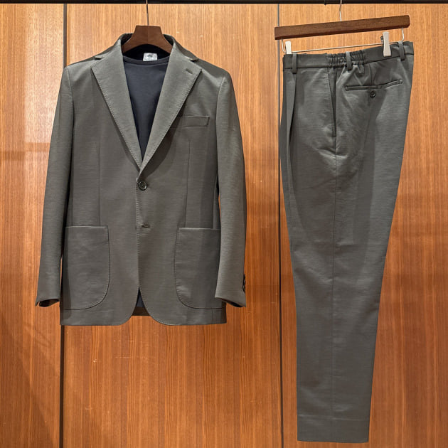 今回は、オリーブのハイゲージポンチジャケットに、ジャケットと同素材のオリーブのハイゲージポンチトラウザーズ、ブラックのラグジュアリーポンチクルーネックカットソーで合わせてみました。