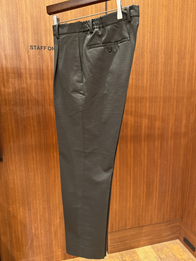 共生地のセットアップのトラウザーズは、ワンプリーツの型で、裾にかけてナチュラルにテーパードしていき、リラックス感がありながら、すっきり見えなレングスラインになります。