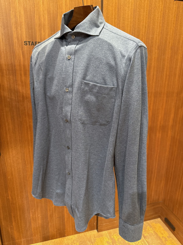 シャツは、カッタウェイカラーのニット鹿の子シャツでございます。