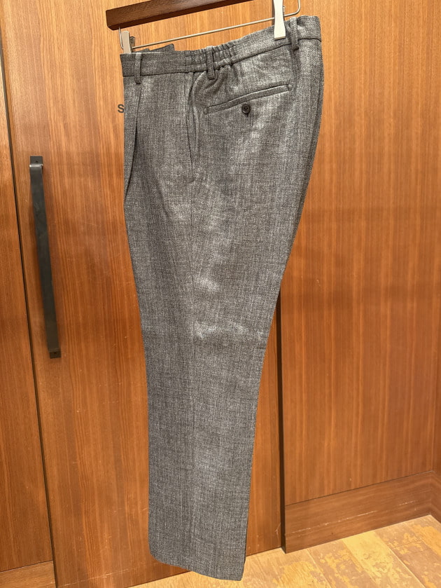 共生地のセットアップのトラウザーズは、ワンプリーツの型で、裾にかけてナチュラルにテーパードしていき、リラックス感がありながら、すっきり見えなレングスラインです。