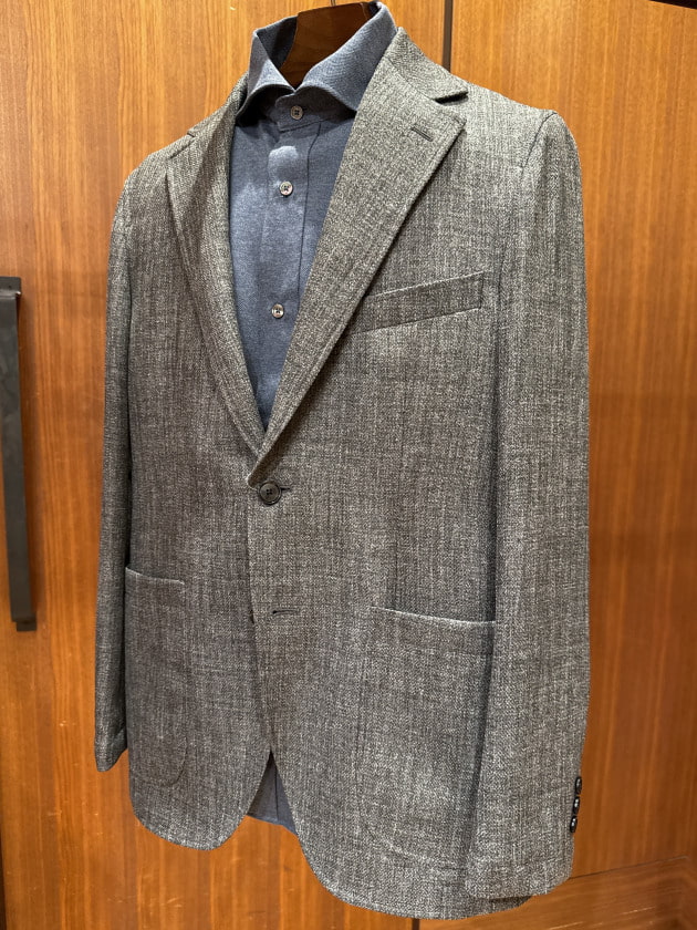 本日は、グレーのミックスツイード2ボタンジャケットのコーディネートのご紹介をさせて頂きます。