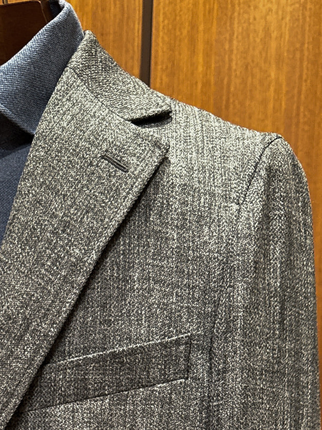 ラペルはナチュラルなロールの仕立てになり、上質な見え感に繋がっております。