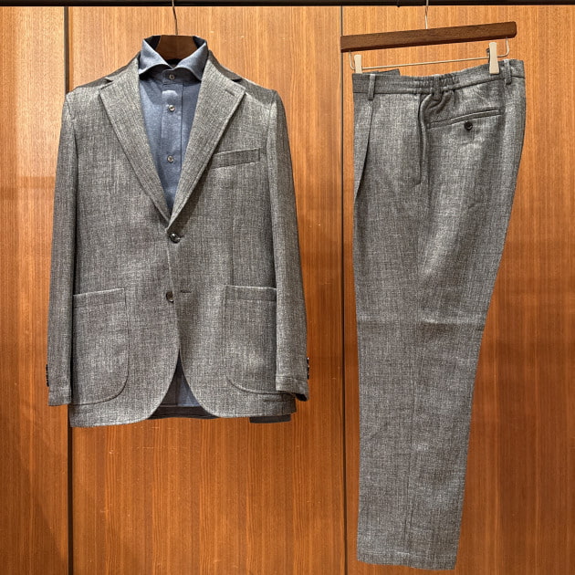 今回は、グレーのミックスツイード2ボタンジャケットに、ジャケットと同素材のグレーのミックスツイードトラウザーズ、インディゴブルーのニットカノコシャツで合わせてみました。