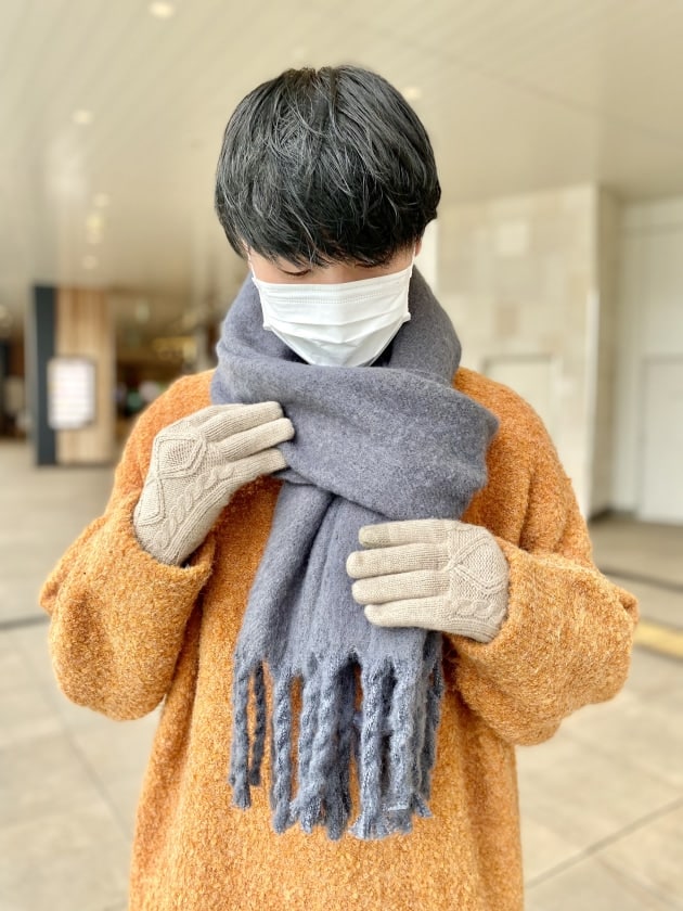 マフラーはボリューム感がある形が好きで今回はこちらを選びました!コートも着たりブルゾンなども着ますがトータルのバランスで見た時にボリューム感がほしかったりするのでマフラーは意外と大判が多いです!グローブはマフラーがシンプルだった分柄物を選びましたが、色は派手にせず落ち着いたトーンにしました。
