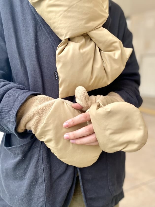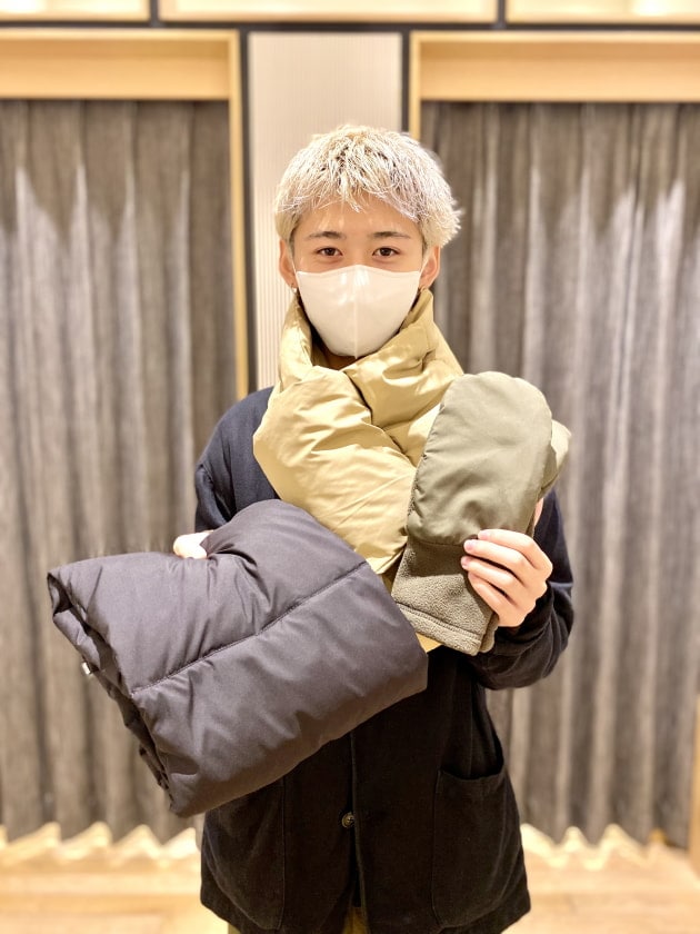 ダウンマフラーは色味もアウトドアっぽい要素が含まれているので自分のワードローブにも取り入れやすく、ダウンやブルゾンをアウターでよく着るのでそこら辺との相性が良いです!